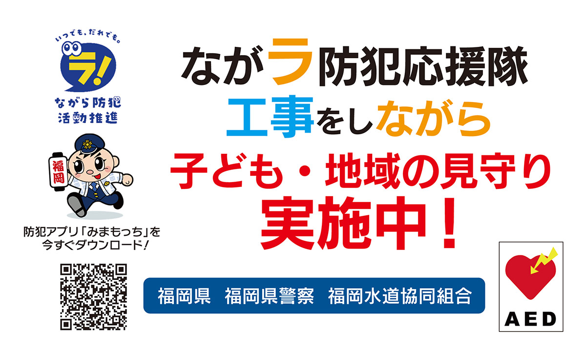 福岡県、福岡県警察、福岡水道協同組合と連携し、ながら防犯活動を実施しています 工事車両にAEDを設置